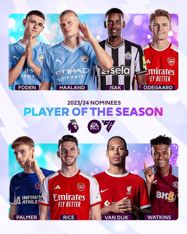 프리미어리그 사무국은 2023-2024시즌 올해의 선수상 후보 8명을 발표했습니다. 후보로는 필 포든, 엘링 홀란(맨체스터 시티), 마틴 외데고르, 데클란 라이스(아스널), 버질 반 다이크(리버풀), 올리 왓킨스(아스톤 빌라), 콜 파머(첼시), 알렉산더 이삭(뉴캐슬)이 선정됐습니다. 시즌 내내 높은 수준의 플레이로 각 팀을 이끈 이 선수들은 팬과 전문가들의 주목을 받고 있습니다.